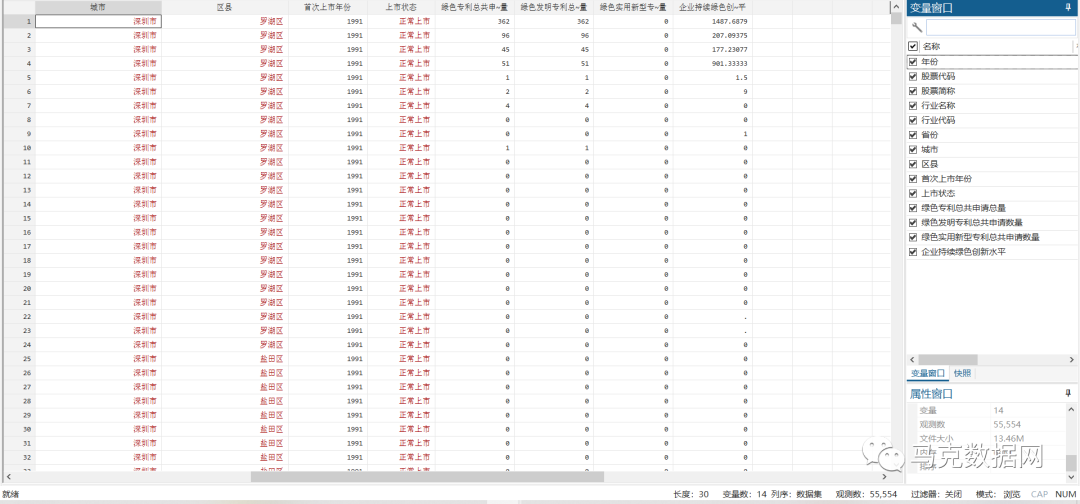 三、指标说明[td]年份 | 股票代码 | 股票简称 | 行业名称 | 行业代码 | 省份 | 城市 | 区县 | 首次上市年份 | 上市状态 | 绿色专利总共申请总量 | 绿色发明专利总共申请数量 | 绿色实用新型专利总共申请数量 | 企业持续绿色创新水平 |