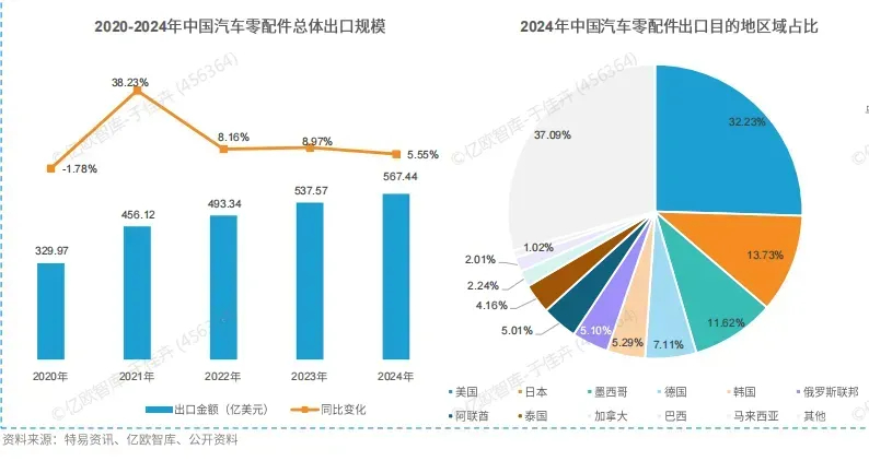途易的爆发并非孤例,而是中国汽配产业“大航海时代”的一个缩影。据统计,2020年至2024年,中国汽车零配件出口金额从329.97亿美元攀升至567.44亿美元,年均保持稳健增长。其中,美国作为全球最大的汽配消费市场之一,以超过32%的份额稳居中国汽配出口目的地之首。