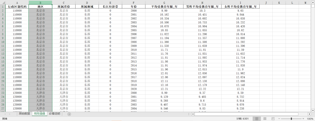 正文平均受教育年限是衡量地区人力资本的重要指标,它表示在一定时期、一定区域内,某一人口群体接受学历教育的年数总和的平均值。xx团队参考陈熠辉(2023)等人的计算方式,依据第五次人口普查(点击查看)、第六次人口普查(点击查看)、第七次人口普查(点击查看),对地级市男女平均受教育年限进行了整理,并对中间年份数据进行了线性插值。