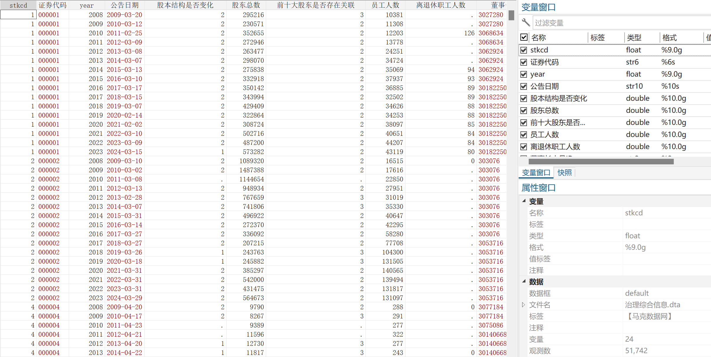 | 公司信息 | 公告日期、股本结构是否变化、股东总数、前十大股东是否存在关联、员工人数、离退休职工人数 |