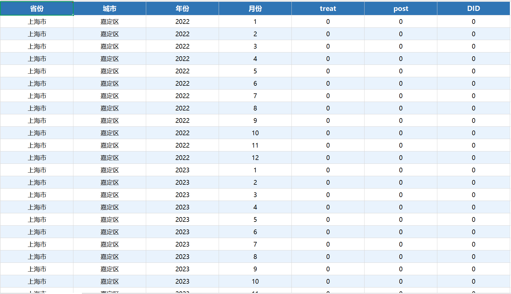 [td]省份 | 城市 | 年份 | 月份 | treat | post | DID |