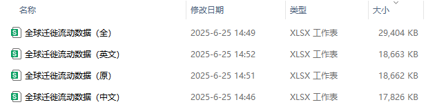全球迁徙流动(Global Migration Flows)指的是人口跨越国界,从一个国家或地区迁移到另一个国家或地区的情况。这种迁移形式多样,既可以是永久性的,也可以是短期或临时性的。其迁移原因丰富,涵盖经济、教育、冲突、环境变化、家庭团聚以及政治因素等多个方面。本数据参考了“Measuring global migration flows using online data”中超过150万的数据,借助Facebook用户的隐私保护记录,以月为计算单位,精确测算了181个国家/地区之间的每月移民流动状况,最终形成了2019至2022年间的全球迁徙数据,包含中文及英文版本。