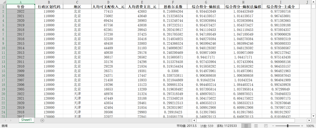 参考韩亮亮等(2022)的文章,团队采用熵权法与主成分分析法,构建了“富裕指数-共同富裕”相关指标,原始数据与计算结果已附上,供各位学者研究参考!因《中国统计年鉴》2013年之前的数据无法直接测算居民恩格尔系数,故我们进行了估算,2013年之前的恩格尔系数=(农村恩格尔系数乡村人口占比 + 城镇恩格尔系数城镇人口占比)