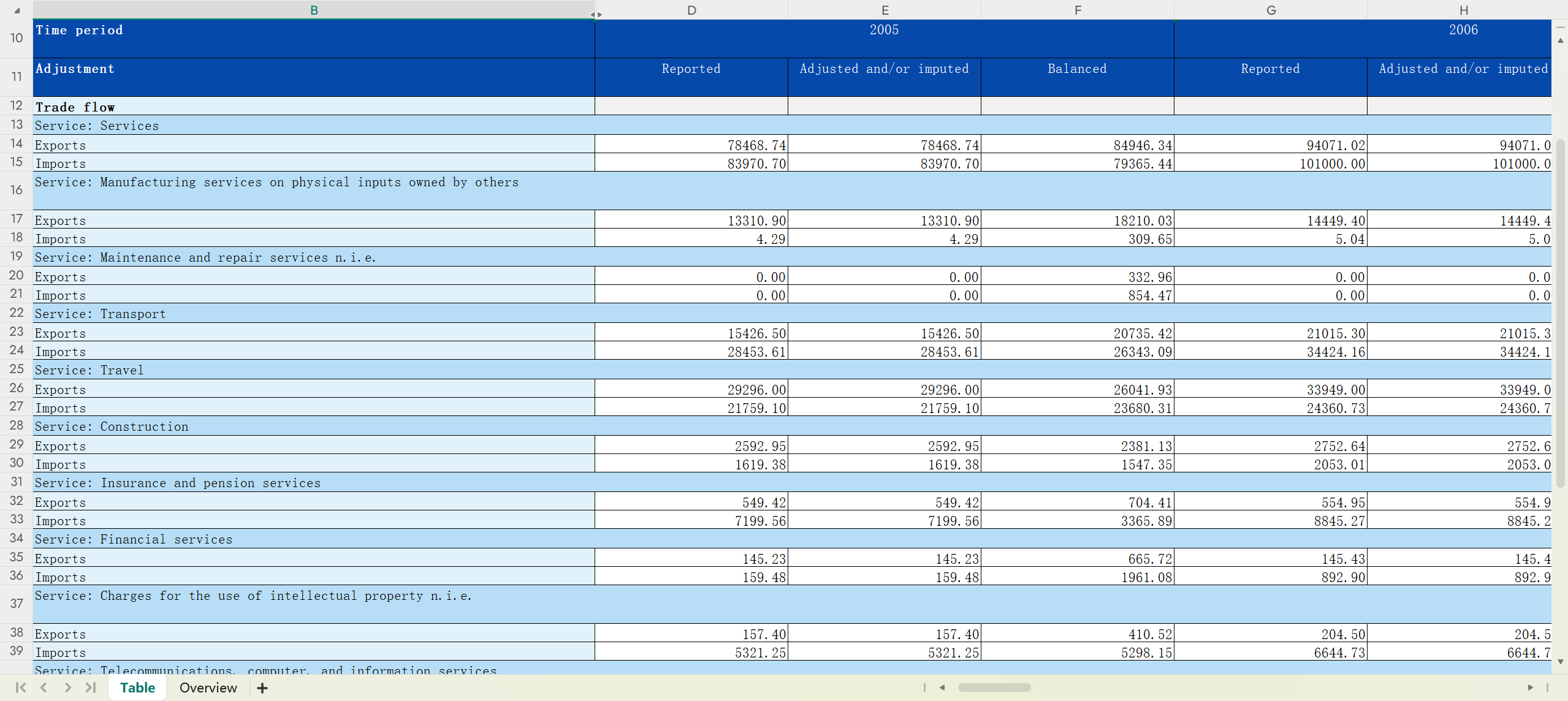 三、数据概览OECD数据库中2005-2023年中国服务贸易进出口相关数据概览