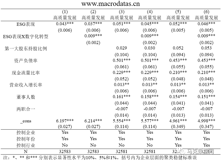 参照王丹(2023)的研究方法,本团队复刻了《统计与决策》中《数字化转型、制造业高质量发展与ESG表现(2011 - 2022年)》一文里的基准回归部分。其中,ESG表现采用华证ESG评分衡量(点击查看),调节变量选取数字化转型水平(点击查看),高质量发展以上市公司 - 全要素生产率来衡量(点击查看)。