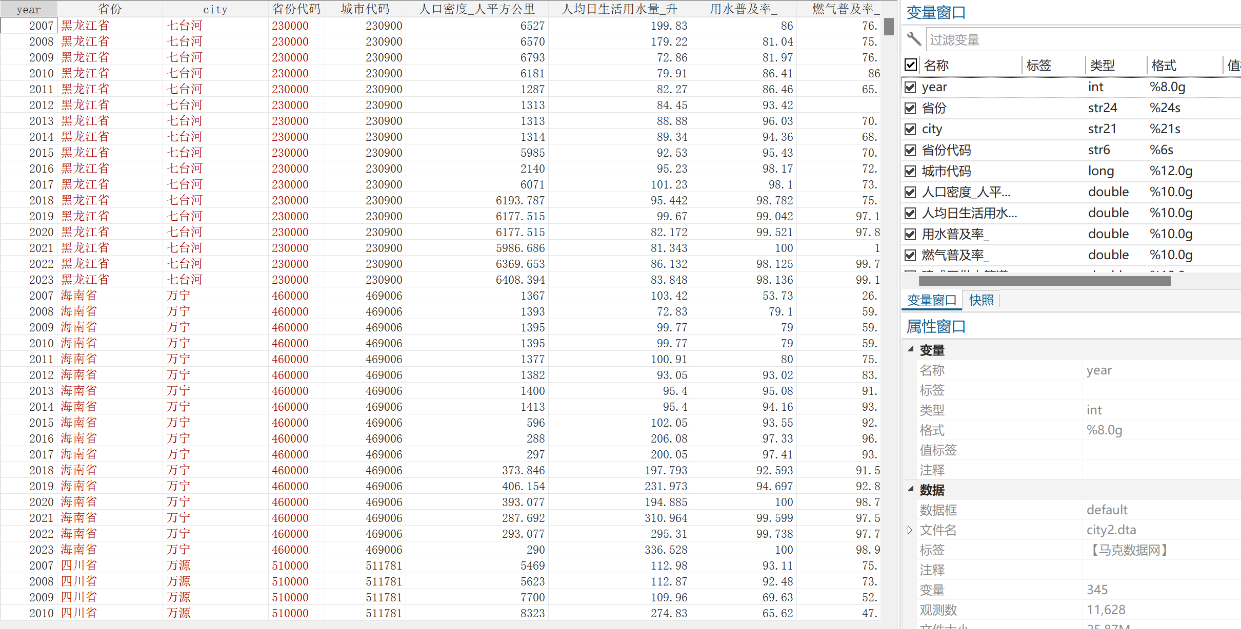 部分指标如下:idyear省份、city城市代码所属地域、人均地区生产总值、人均地区生产总值的对数、城镇居民人均可支配收入、农村居民人均可支配收入、城乡居民人均收入之比、城镇居民人均消费支出、农村居民人均消费支出、城乡居民人均消费之比、职工工资水平的对数、第一产业从业人员数、第二产业从业人员数、第三产业从业人员数、第一产业产值/第一产业从业人员、第二三产业产值、第二三产业从业人员、第二三产业产值/第二三产业从业人员、二元对比系数、城乡就业结构、地方财政一般预算内支出、科学支出、科技创新能力、教育支出、城乡基础教育、执业助理医师数、城镇职工基本养老保险参保人数、常住人口城乡养老保险覆盖系数、失业保险参保人数、城乡失业保险覆盖系数、固定资产投资总额、地区生产总值、城乡基础设施建设、行政区域土地面积、城乡人口密度、人均道路面积、城镇常住人口、常住人口城镇化率、建成区面积、邮政业务收入、人均邮政业务收入量、建成区面积比、建成区绿化覆盖率、人均公园绿地面积、生活垃圾处理率、污水处理率、城乡经济总量、城乡居民人均收入之比、城乡居民人均消费之比、城乡工资性收入、城乡医疗水平、城乡交通网络、人口城镇化率、人均通信支出、绿化覆盖率、公园绿地面积、生活垃圾处理、污水处理、城乡融合发展水平_熵值法、城乡融合发展水平_熵权topsis(注:最终以变量说明表为准)