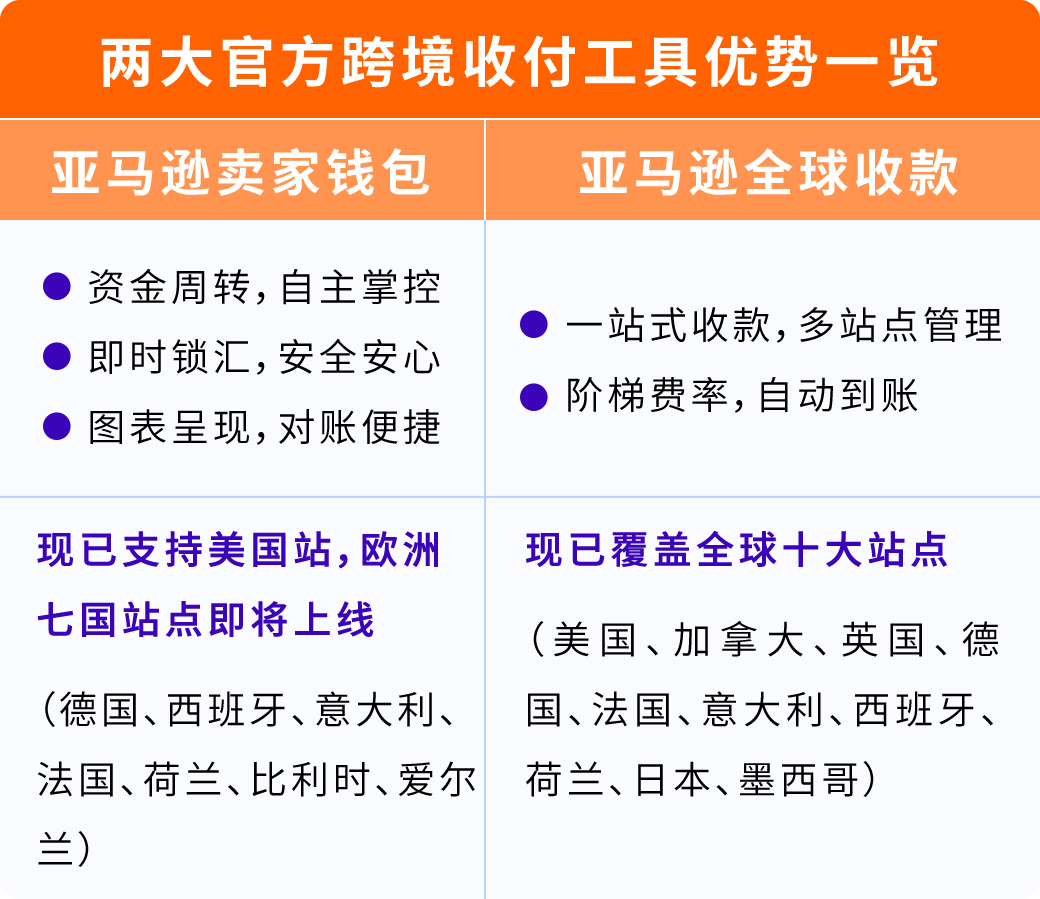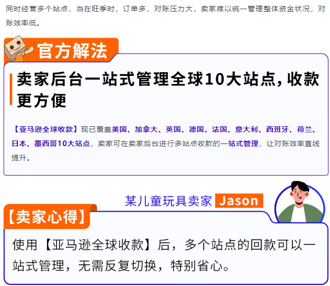 卖家可以把“收钱这件事”交给【亚马逊全球收款】统一处理: