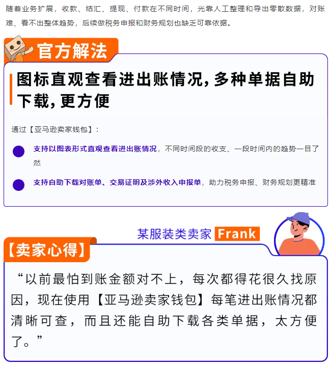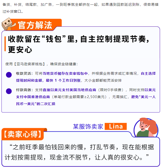 (1)若您希望能灵活持有部分美元收入,同时可按需将部分资金以人民币转入国内银行账户,并支持即时锁汇,根据实时汇率灵活控制货币兑换、提现时间以及金额,且还需要直接向供应商支付款项,推荐使用【亚马逊卖家钱包】