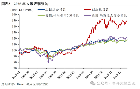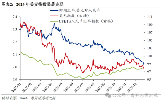 一是美元指数走弱,人民币对美元汇率被动走强。汇率是两种货币之间的比价,美元自身贬值,人民币对美元汇率自然升值。2025年上半年,市场对美国经济走弱、美联储降息的预期持续升温,同时特朗普对外加征关税、对内减税的政策主张和举措,进一步加剧了市场对美国经济前景以及美国财政和债务可持续性的担忧,“去美元化”成为流行叙事,美元指数由年初的110点左右持续下滑至年中的96点左右。2025年下半年,随着美国关税战缓和、美国经济仍具韧性、市场对于美联储大幅降息的预期得到修正,美元指数趋于稳定,在96-100点的区间内震荡。11月21日以来,美元指数由100点左右回落至97点左右,带动人民币对美元汇率加速升值。 二是中国股市走强,人民币资产吸引力上升。前几年受国内房地产市场和股市持续低迷影响,人民币对美元汇率持续承压。但2024年926政治局会议以来,A股走出一轮科技突破和产业驱动、制度改革、资金流入和风险偏好提升共同推动下形成的“科技重估牛”。上证指数全年走势与美股不相上下,创业板指更是在三季度加速上涨,涨幅远超纳斯达克指数。外资机构对于中国资产的“ABC叙事”两极反转,从“Anything but China”(除了中国以外都能买)变为“AI BABA China”(人工智能、阿里巴巴、中国)。