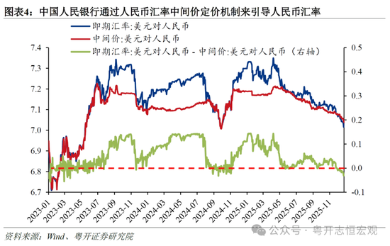 四是中国人民银行为保持人民币对一篮子货币汇率稳定,引导人民币对美元汇率合理有序升值。特朗普对华大幅加征关税,在导致美元指数下降的同时,也对人民币带来了较大贬值压力。中国人民银行使用逆周期因子,对人民币汇率中间价进行调节,引导市场汇率向偏强侧运行。2025年1-4月,人民币汇率贬值压力较大,逆周期因子加强,体现为人民币对美元即期汇率与中间价的大幅偏离,人民币对美元汇率保持相对稳定。随着中国对美坚决反制、中国出口保持强劲韧性、中国股市走强,人民币贬值压力减轻,逆周期因子调节力度减弱。但为保持人民币对一篮子货币汇率稳定,中国人民银行仍引导人民币汇率适度升值,人民币对美元汇率在市场和政策共同作用下持续走强,由4月9日的7.35持续升至破7。12月8日以来,人民币对美元即期汇率持续强于中间价,反映出中国人民银行在防范人民币汇率过快升值。