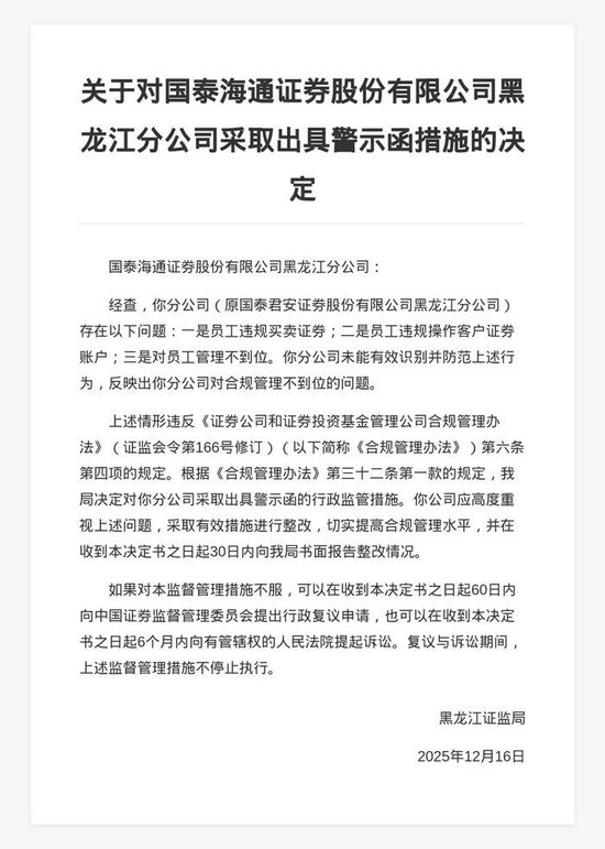 近日,黑龙江证监局发布关于对国泰海通黑龙江分公司采取出具警示函措施的决定。今年以来,国泰海通已多次因经纪、投行业务违规收到监管警示。 经黑龙江证监局调查,国泰海通黑龙江分公司(原国泰君安黑龙江分公司)存在多项问题,一是员工违规买卖证券,二是员工违规操作客户证券账户,三是对员工管理不到位