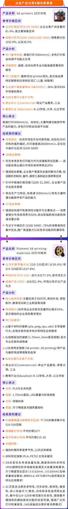 与C端消费者相比,亚马逊B端客户展现出了截然不同的商业特征。由于大多数B端买家具备一定的3D打印使用基础,他们对产品的包容性显著更高,这直接带来了“两低一高”的优质表现:价格敏感度低、退货率低、品牌复购率高。
