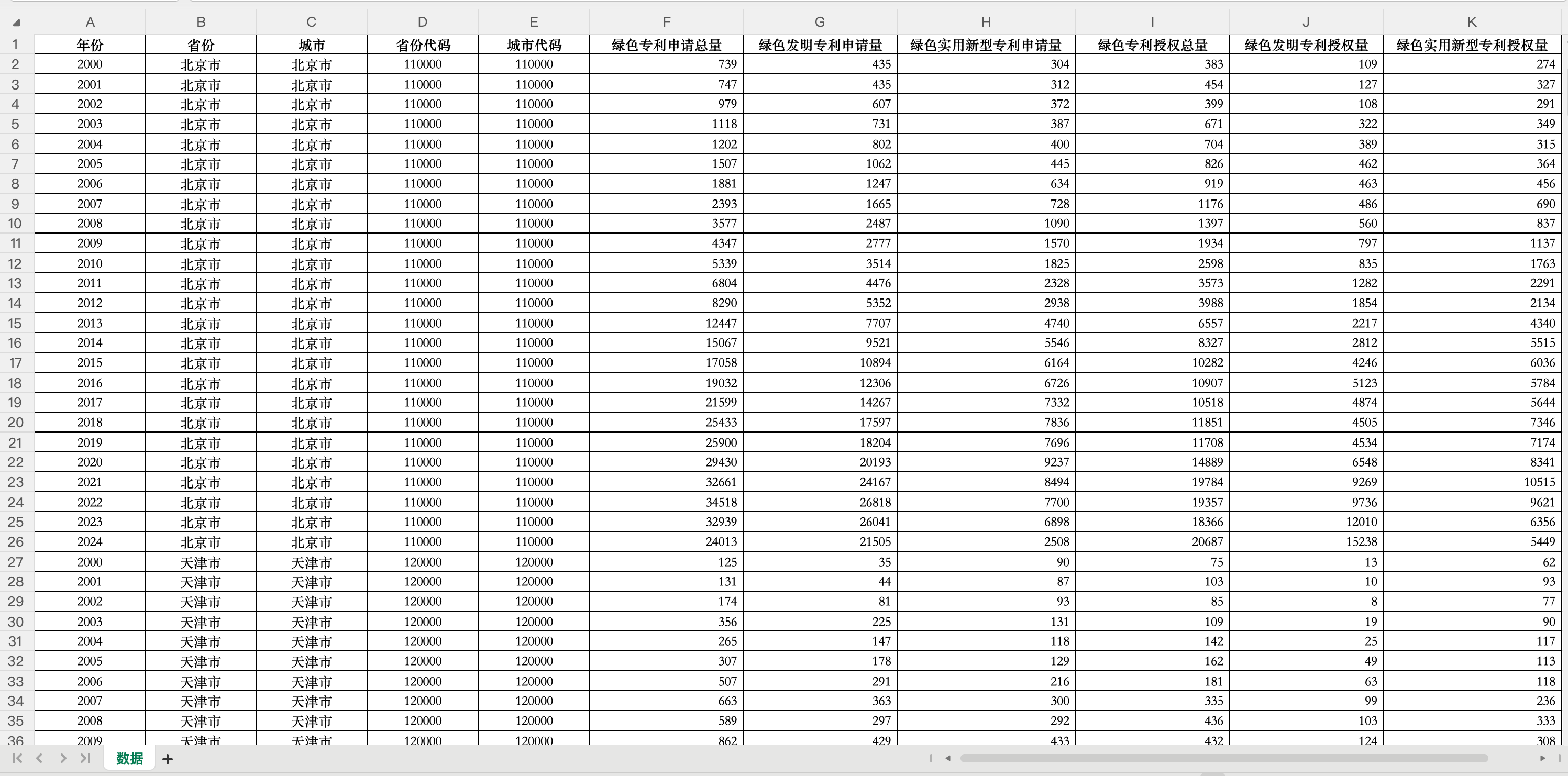 省份代码 | 城市代码 | 绿色专利申请总量 |