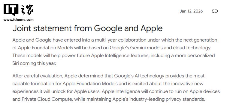 在隐私问题上,苹果与谷歌强调,现有的隐私保护机制不会因合作而发生改变。Apple Intelligence 仍将运行在本地设备以及苹果 Private Cloud Compute 架构之上,继续遵循苹果一贯强调的高标准隐私策略。声明中并未提及谷歌可访问用户数据,暗示谷歌仅提供底层模型与云技术支持,具体部署与数据防护仍由苹果负责。