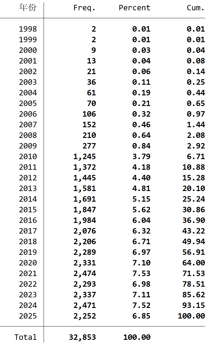 2. 中国县域政府工作报告-历年报告数量:各年度报告数量统计