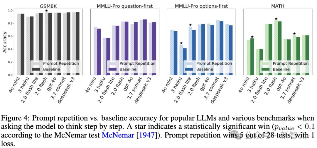 在要求模型逐步思考时,主流LLMs在各类基准测试中使用提示重复与基线方法的准确率对比。提示重复在28次测试中赢了5次,输了1次。