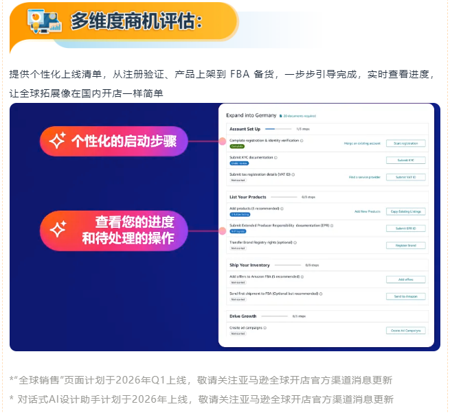 升级版“全球销售”页面+选品指南针,叠加2026年即将上线的对话式AI功能,从商机评估到合规配送,全程AI护航,解决全球拓展的所有难题: