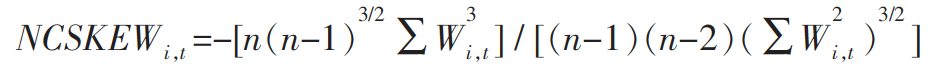 (2)中,n为股票i在某年的交易周数。NCSKEW的值越大,意味着负收益偏态系数越大,股价崩盘风险越高。