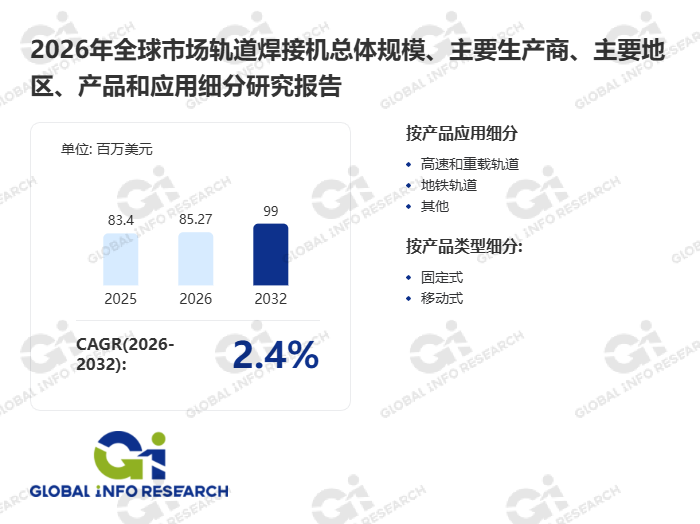据GIR (Global Info Research)调研,按收入计,2025年全球轨道焊接机收入大约83.4百万美元,预计2032年达到99百万美元,2026至2032期间,年复合增长率CAGR为2.4%。