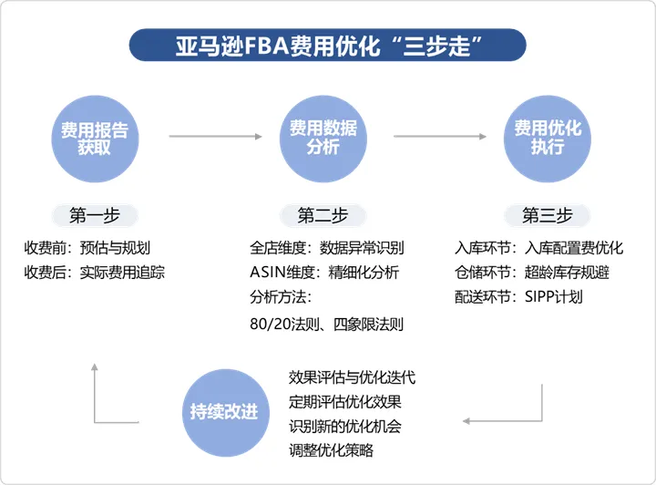 基于亚马逊平台的数据与官方团队支持,子不语采用了“亚马逊供应链成本优化解决方案”中FBA费用优化三步法,跑通了“数据获取→诊断分析→优化执行”的闭环: