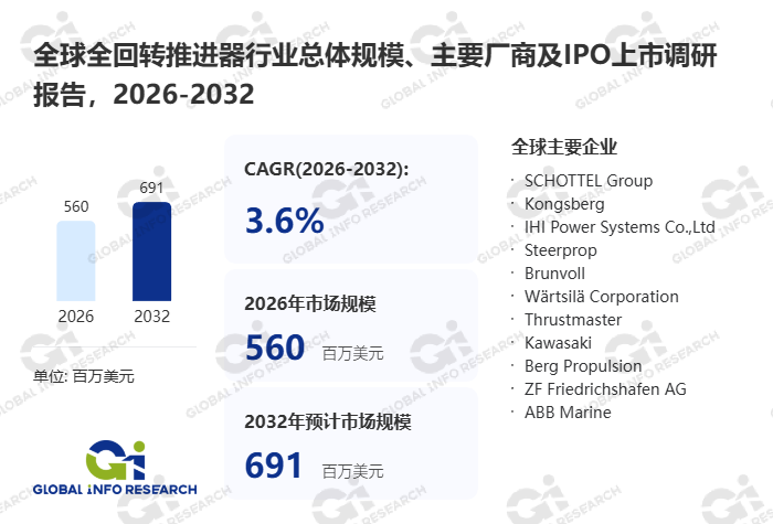 根据本项目团队最新调研,预计2032年全球全回转推进器产值达到691百万美元,2026-2032年期间年复合增长率CAGR为3.6%。