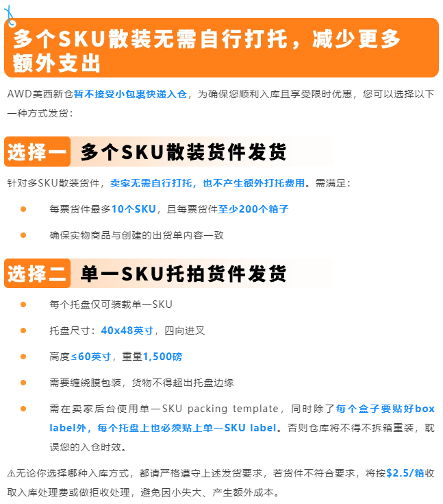 2026年12月31日前,成功入库至AWD美西新仓,且货件符合发货要求,即可享受入库处理费专属折扣价——$1.05/箱(常规价$1.4/箱),单箱直接节省$0.35。对于春节前需大量备货的卖家来说,是真正落在成本账上的优惠。