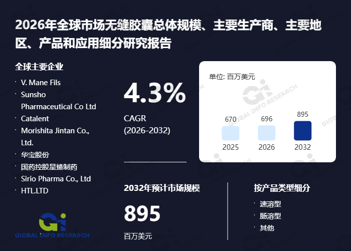 据GIR (Global Info Research)调研,按收入计,2025年全球无缝胶囊收入大约670百万美元,预计2032年达到895百万美元,2026至2032期间,年复合增长率CAGR为4.3%。