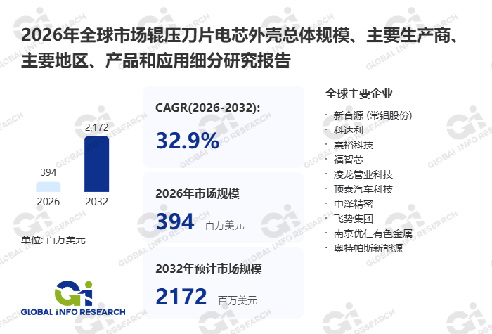 据GIR (Global Info Research)调研,按收入计,2025年全球辊压刀片电芯外壳收入大约302百万美元,预计2032年达到2172百万美元,2026至2032期间,年复合增长率CAGR为32.9%。