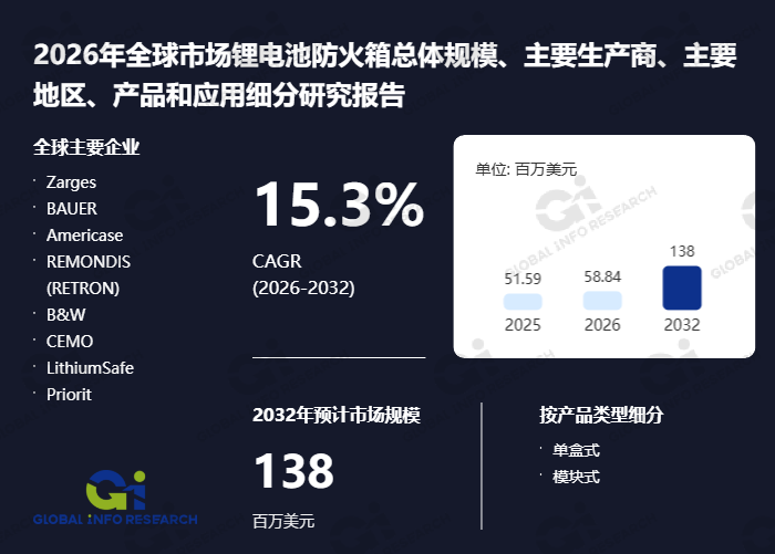 据GIR (Global Info Research)调研,按收入计,2025年全球锂电池防火箱收入大约51.59百万美元,预计2032年达到138百万美元,2026至2032期间,年复合增长率CAGR为15.3%。