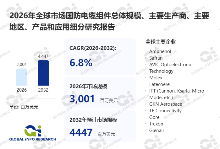 据GIR (Global Info Research)调研,按收入计,2025年全球国防电缆组件收入大约2824百万美元,预计2032年达到4447百万美元,2026至2032期间,年复合增长率CAGR为6.8%。