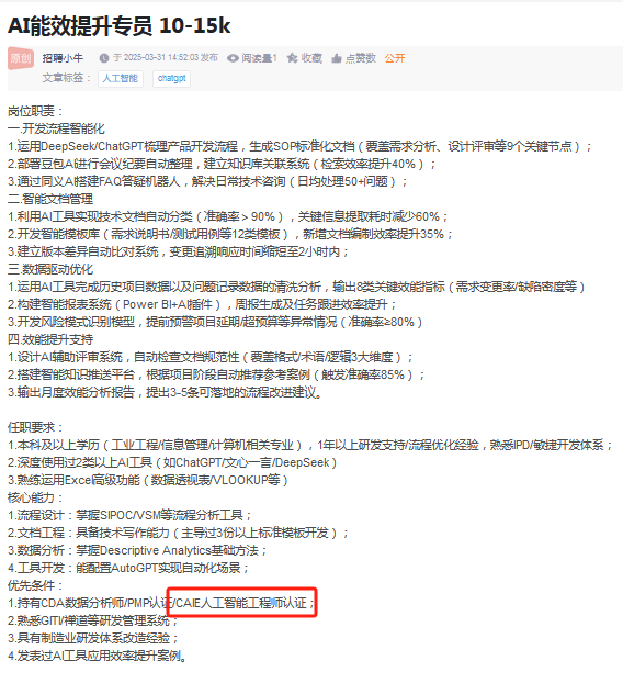企业认可度:国内千余家企业认可CAIE认证价值,华为、阿里巴巴、格力、中国平安、南方电网等企业的员工中均有不少CAIE持证人,众多企业在AI产品经理、金融银行技术岗、商业智能顾问等岗位招聘中,明确将CAIE持证列为优先录用条件。薪资数据显示,工作经验1年以下的Level I持证人,月薪普遍高于同经验非持证人群,且适配一线城市与中小城市;Level II持证人因具备深厚AI技术能力,成为企业重点吸纳对象,多数可实现升职加薪,月薪高达35K。
