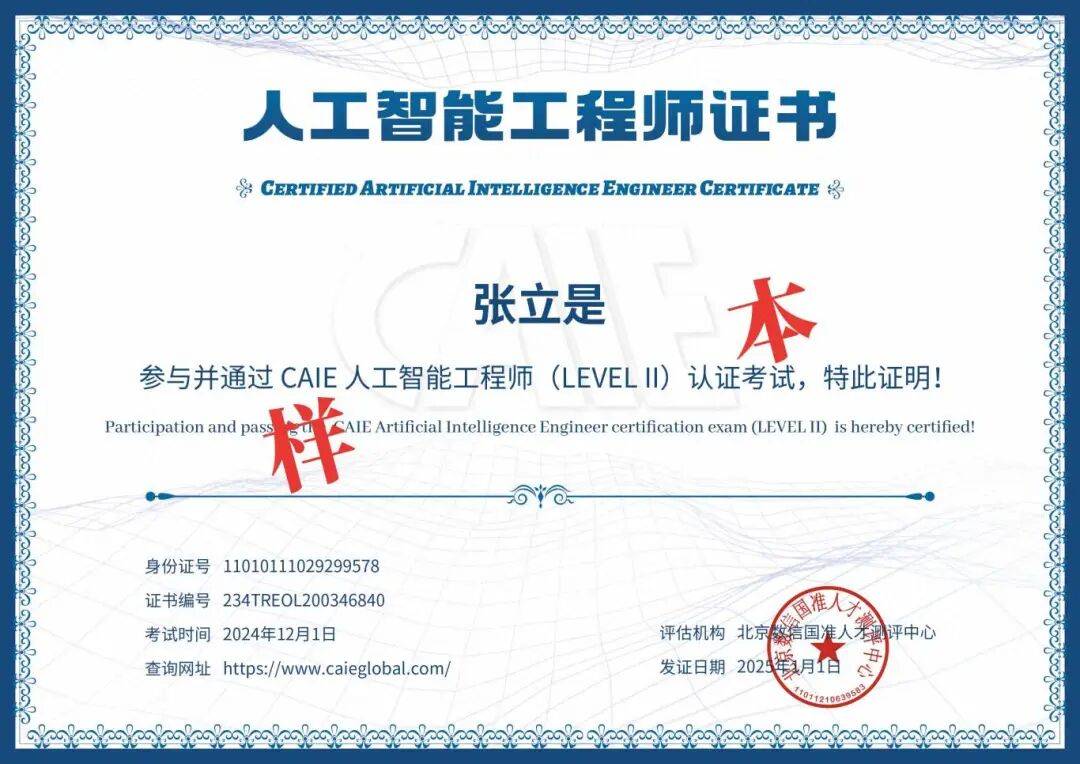 1. CAIE注册人工智能工程师认证(CAIE·赛一认证)核心定位:CAIE注册人工智能工程师认证,由CAIE人工智能研究院颁发,是聚焦人工智能领域的技能等级认证,旨在培养和评估具备理论基础+实战能力的复合型AI人才。作为国内少数同时获得头部企业广泛认可、且对零基础完全开放的AI综合认证,其体系密切关注AI领域最新科研成果和技术动态,及时纳入考核与课程,确保持证人紧跟行业前沿,兼顾能力提升与职场适配,通过考试者可获得中英文双认证证书。