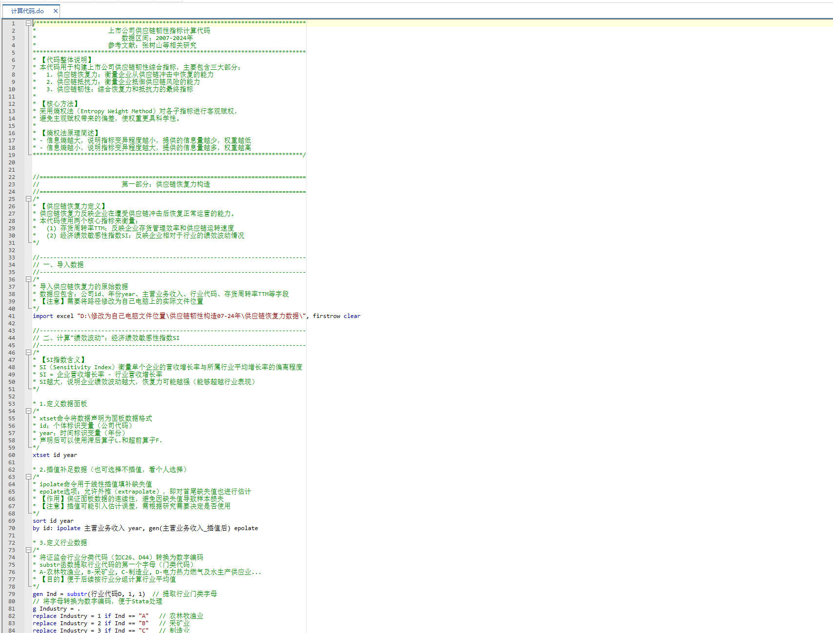 熵值法测算供应链抵抗力、恢复力及供应链韧性。本数据包含原始数据、计算代码、参考