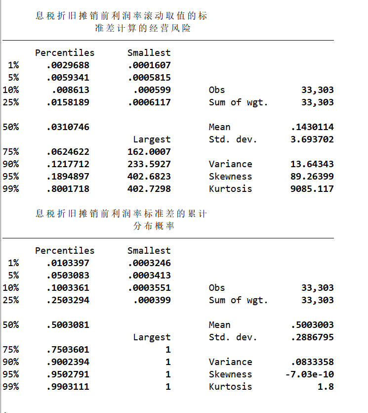 另外,由于按这种方法计算的经营风险不服从正态分布,所以本文计算了代表经营风险的息税折旧摊销前利润率标准差的累积分布概率,并用息税折旧摊销前利润率标准差的累积分布概率来衡量经营风险Risk。