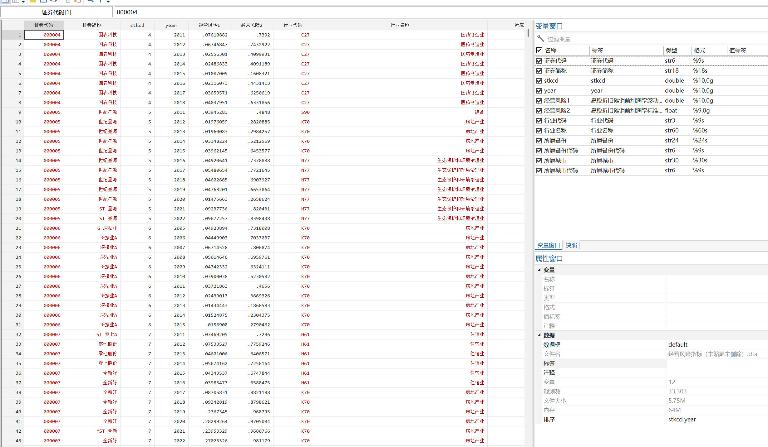 行业参照证监会2012年行业分类标准,制造业用二级行业分类,其他用一级分类来计算并对连续型变量进行了1%和99%分位数的缩尾处理