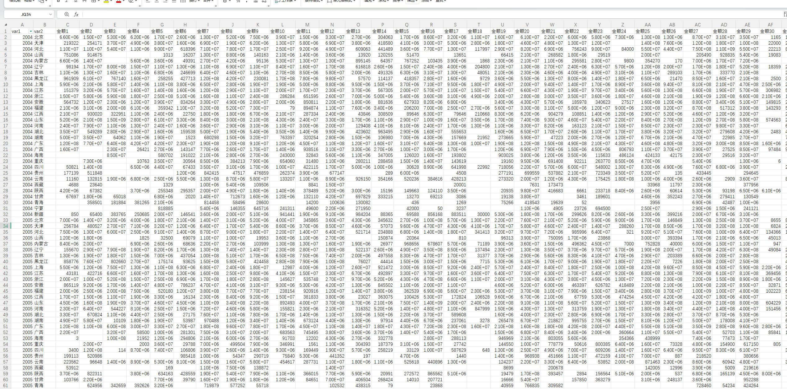 金额1~金额38 38种农产品的出口金额(金额x对应38个产品的顺序,名字仅为方便计算)
