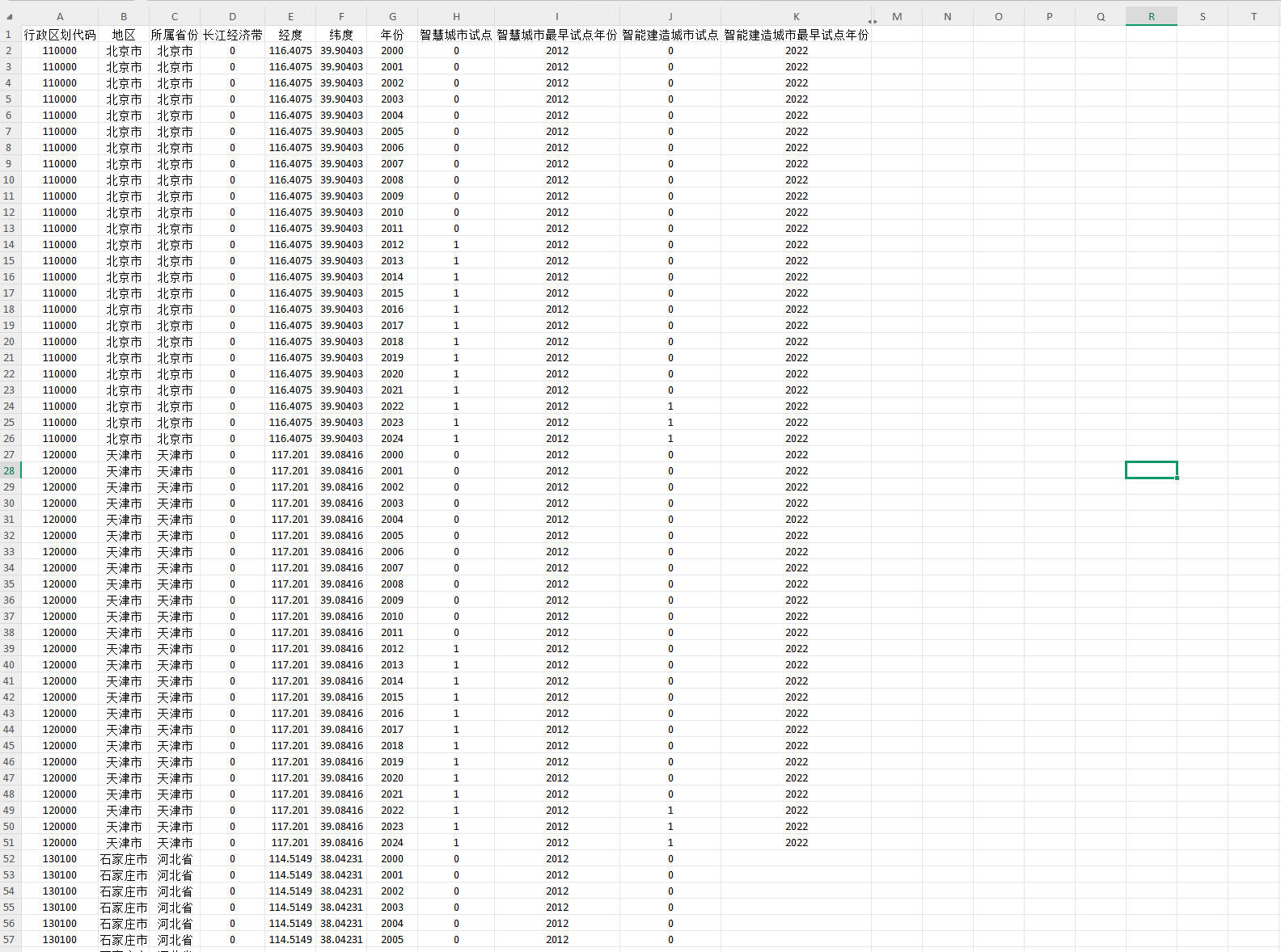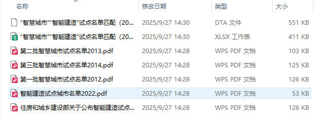 - 数据说明:内含原始文件和匹配结果,将智慧城市试点获批当年及以后的政策虚拟变量项是否试点赋值为1,获批之前赋值为0