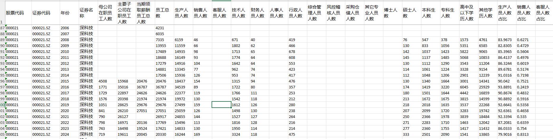 数据指标:股票代码 证券代码 年份 证券名称 母公司在职员工人数 主要子公司在职员工人数 当期领取薪酬员工总人数 员工总数 生产人员人数 销售人员人数 客服人员人数 技术人员人数 财务人员人数 人事人员人数 行政人员人数 综合管理人员人数 风控稽核人员人数 采购仓储人员人数 其它专业人员人数 博士人数 硕士人数 本科生人数 专科生人数 高中及以下学历人数 其他学历人数 生产人员人数占比 销售人员人数占比 客服人员人数占比 技术人员人数占比 财务人员人数占比 人事人员人数占比 行政人员人数占比 综合管理人员人数占比 风控稽核人员人数占比 采购仓储人员人数占比 其它专业人员人数占比 博士人数占比 硕士人数占比 本科生人数占比 高中及以下学历人数占比 其他学历人数占比 专科生人数占比