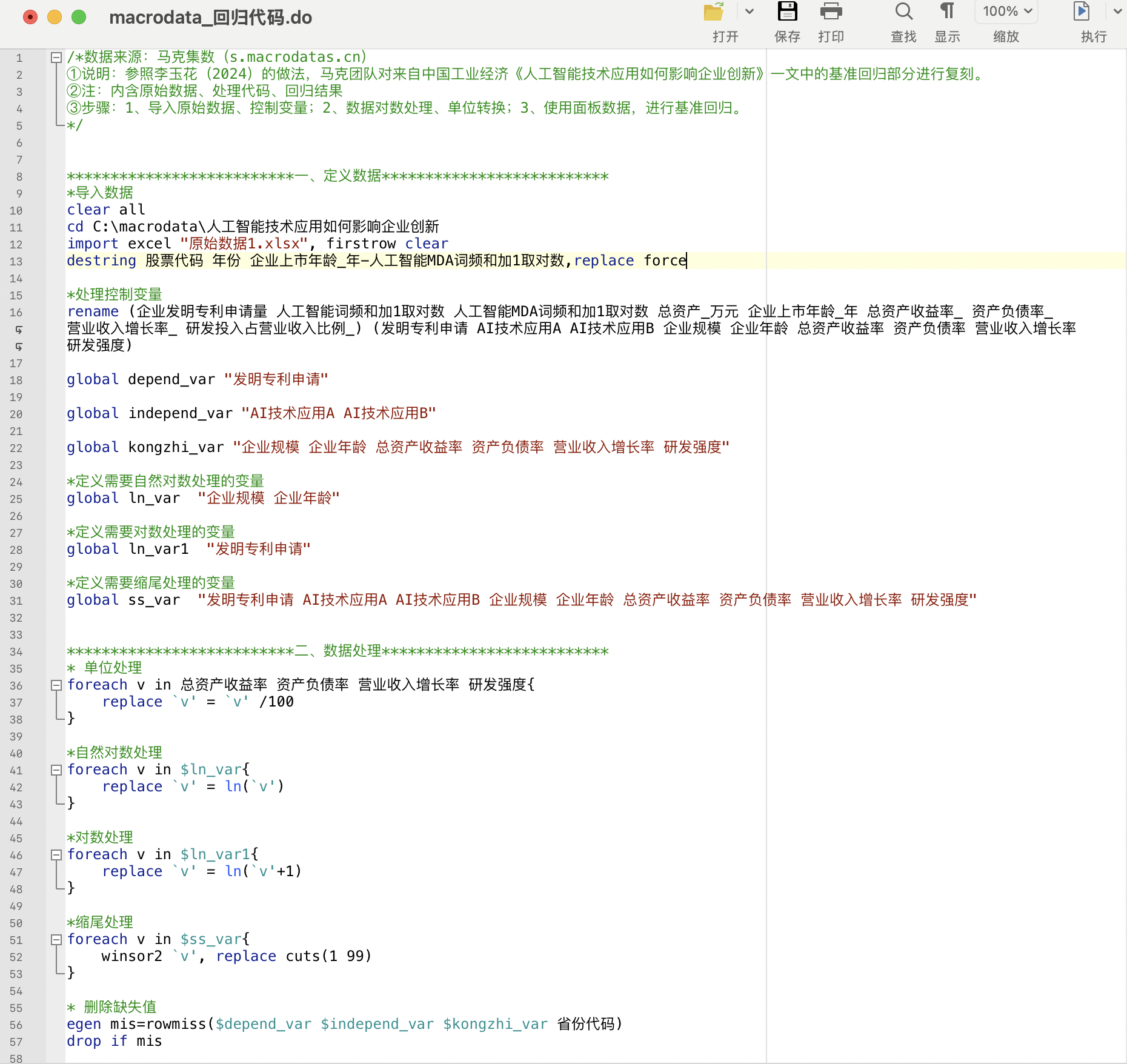 基于2007-2024年中国A股上市公司数据,实证分析人工智能技术对上市公司创新的影响效应参照李玉花(2024)的做法,团队对来自《中国工业经济》《人工智能技术应用如何影响企业创新》一文中的基准回归部分进行复刻,包括原始数据、处理dofile,基准回归代码