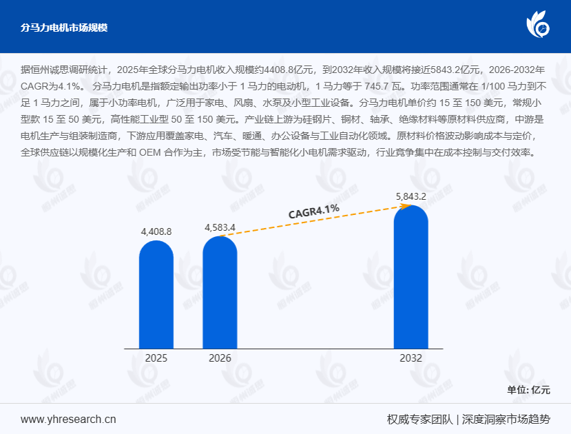 据恒州诚思调研统计,2025年全球分马力电机收入规模约达4408.8亿元,预计到2032年,这一数字将接近5843.2亿元,2026 - 2032年复合增长率(CAGR)为4.1%。分马力电机作为小功率电机的典型代表,额定输出功率小于1马力(1马力等于745.7瓦),功率范围通常在1/100马力到不足1马力之间,在多个领域有着广泛应用。其单价约在15至150美元,常规小型款价格在15至50美元,高性能工业型则处于50至150美元区间。