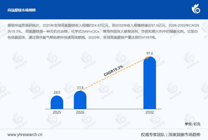 据恒州诚思调研统计,2025年全球高氯酸铵收入规模约达24.87亿元,至2032年这一规模将接近97.6亿元,2026 - 2032年复合增长率(CAGR)为19.3%。在国防科技与航空航天产业蓬勃发展的当下,高氯酸铵作为关键材料,其市场规模的显著增长备受行业关注。深入剖析其发展现状与未来趋势,对于产业链各环节参与者把握市场机遇、制定战略决策具有重要意义。