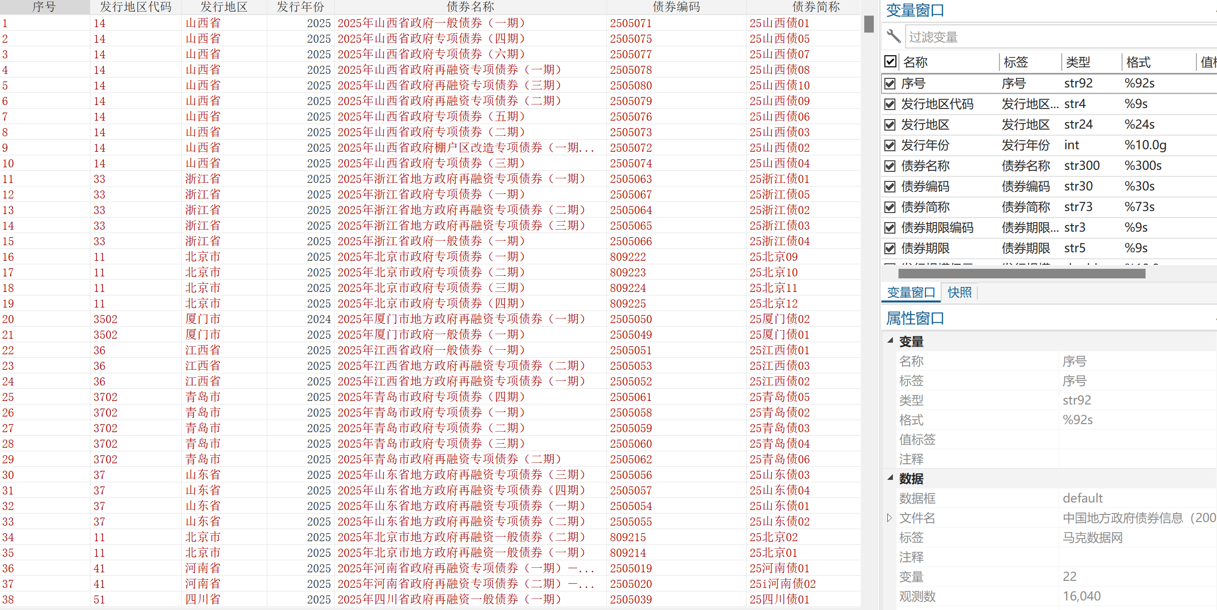 数据名称:地方政府债券数据