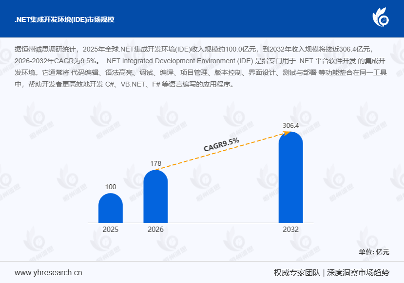 据恒州诚思调研统计,2025年全球NET集成开发环境(IDE)收入规模约100.0亿元,至2032年将攀升至近306.4亿元,2026-2032年复合增长率(CAGR)达9.5%。这一增长受AI原生化、云原生化及跨平台协同三大技术趋势驱动,同时企业级开发对效率、安全与持续交付的需求升级成为核心推力。