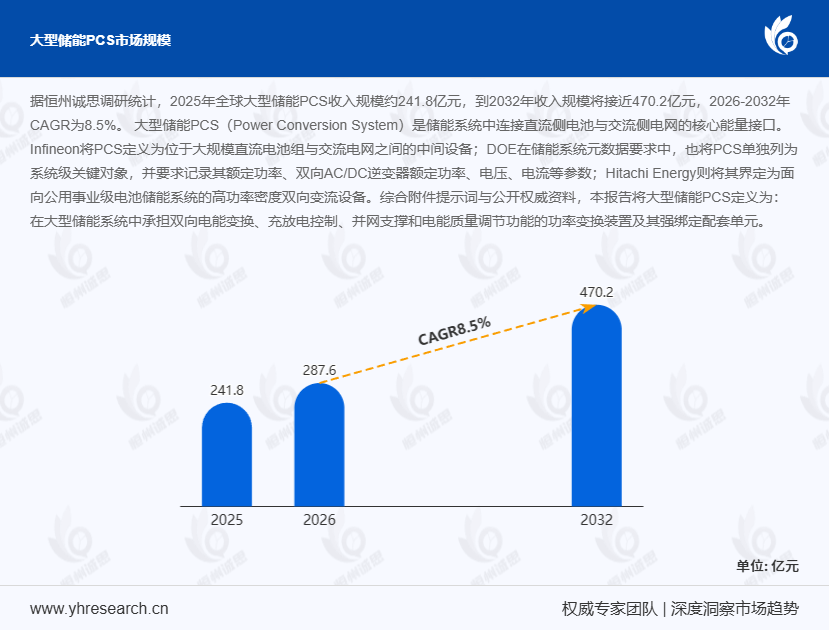据恒州诚思调研统计,2025年全球大型储能PCS市场规模将达241.8亿元,预计到2032年将增长至470.2亿元,2026-2032年复合增长率(CAGR)为8.5%。作为新型电力系统建设的核心装备,大型储能PCS正经历从政策培育期向规模化放量期的关键转型,其技术迭代、市场结构与竞争逻辑均呈现显著变化。