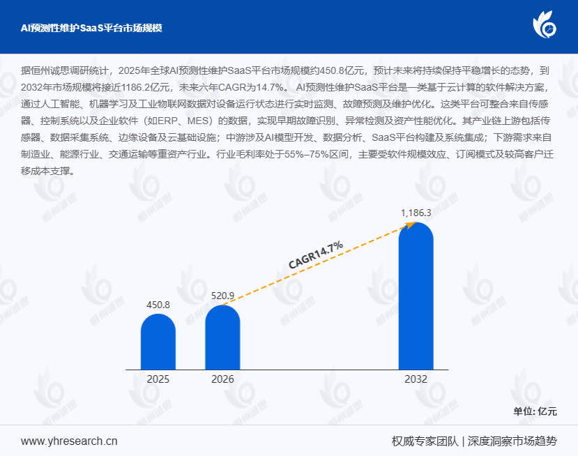 据恒州诚思调研统计,2025年全球AI预测性维护SaaS平台市场规模约450.8亿元,预计未来将持续保持平稳增长的态势,到2032年市场规模将接近1186.2亿元,未来六年CAGR为14.7%。