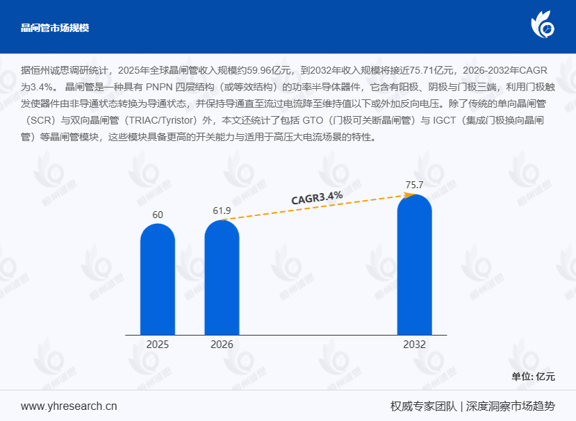 据恒州诚思调研统计,2025年全球晶闸管收入规模约59.96亿元,到2032年收入规模将接近75.71亿元,2026-2032年CAGR为3.4%。