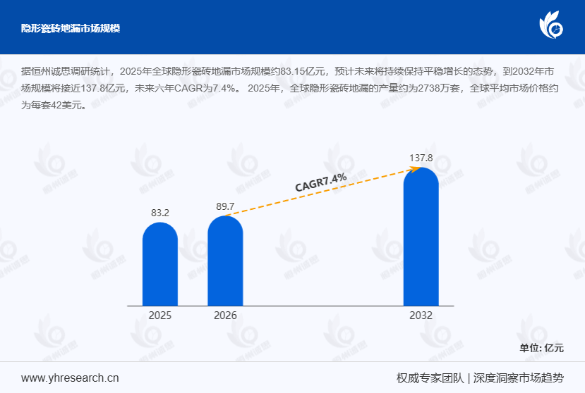 据恒州诚思(YH Research)最新调研报告,全球隐形瓷砖地漏市场规模预计2026年达1240.9百万美元,2032年将攀升至1958.2百万美元,2026-2032年预测期内复合年增长率达7.90%。这一数据表明,隐形瓷砖地漏市场正处于快速增长通道,未来发展空间广阔。