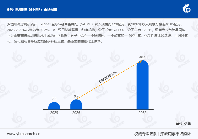 5-羟甲基糠醛(5-HMF)作为以生物质为原料制备的关键平台化合物,由碳水化合物经脱水反应生成。其分子结构具备高反应活性,能通过多种化学反应转化为各类高附加值化工产品,是连接可再生生物质资源与高端新材料、精细化学品的核心中间体。据恒州诚思(YH Research)调研团队发布的《全球5-羟甲基糠醛(5-HMF)市场报告2026 - 2032》显示,预计2032年全球5-羟甲基糠醛市场规模将攀升至3亿美元,未来几年年复合增长率CAGR达42.6%,展现出强劲的增长态势。