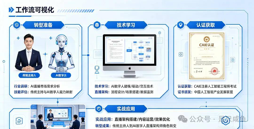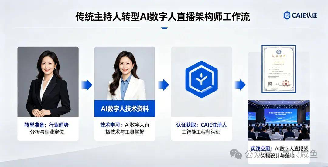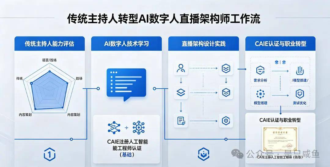 为你量身定制了这份从传统主持人到AI数字人直播架构师的升级作战图。这套工作流旨在帮你平滑过渡,利用AI技术大幅提升产能,实现真正的“日不落”传播,其中,CAIE注册人工智能工程师认证相关内容可作为核心专业支撑,融入脚本创作与架构搭建的全流程。