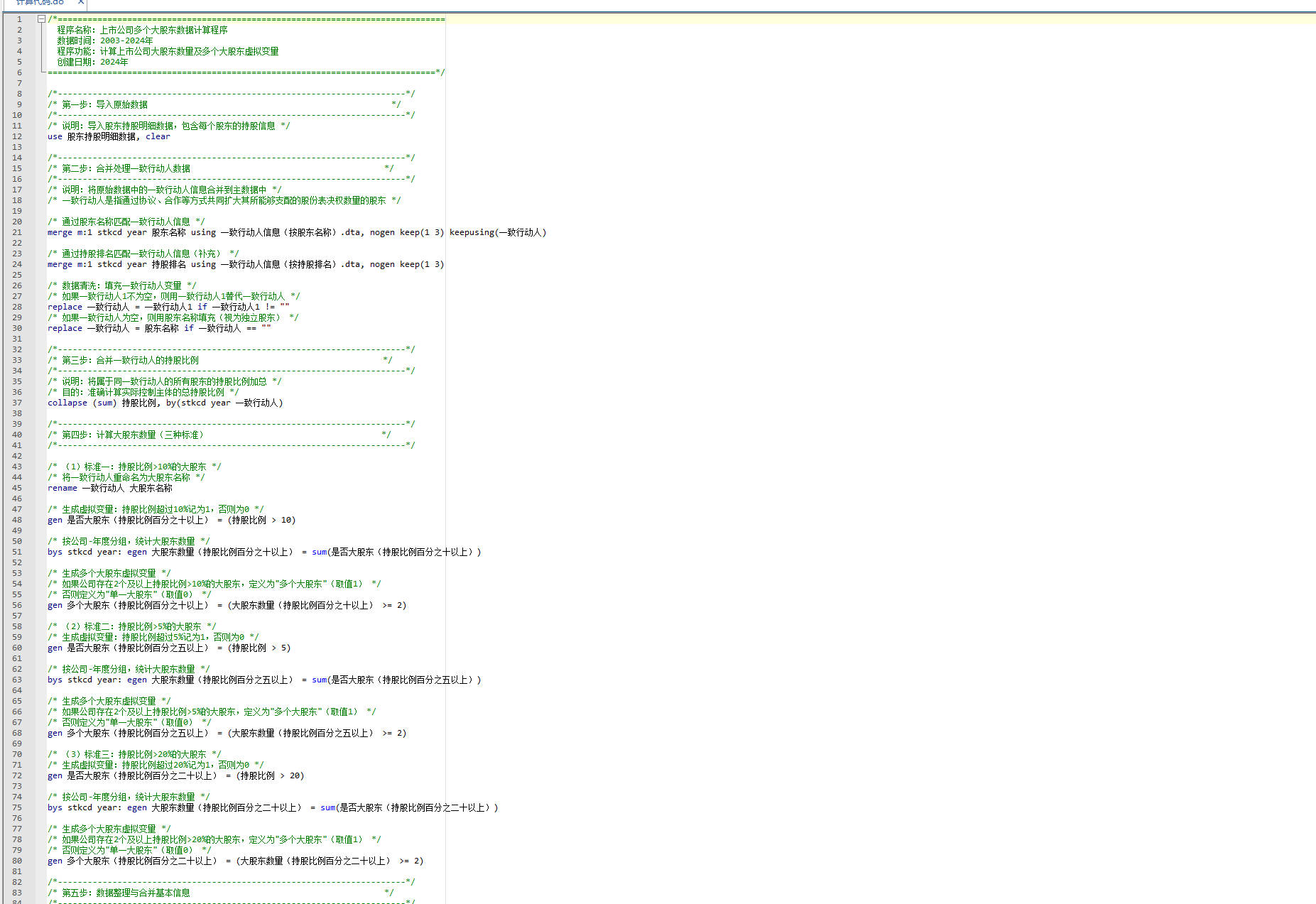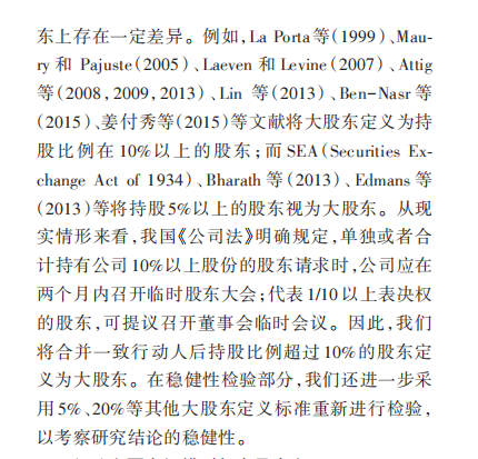 【多个大股东(持股比例百分之五以上)】即是否存在多个大股东:如果公司存在两个及以上持股比例超过5%的大股东,将其界定为“多个大股东",多个大股东(持股比例百分之五以上)取值为1,反之则将其称为"单一大股东",多个大股东(持股比例百分之五以上)取值为0。